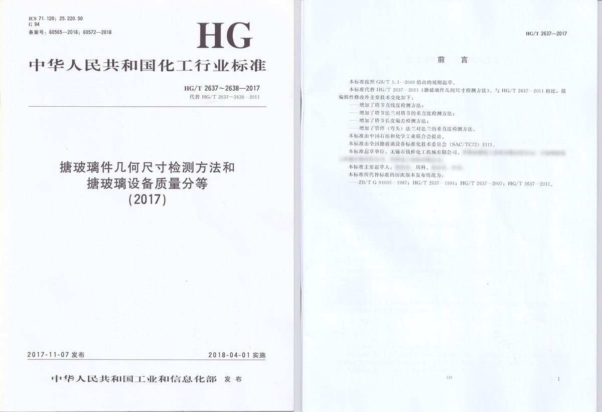 無錫錢橋化工機械有限公司參與起草中華人民共和國化工行業標準HG/T 2637~2638-2017《搪玻璃件幾何尺寸檢測方法和搪玻璃設備質量分等》。